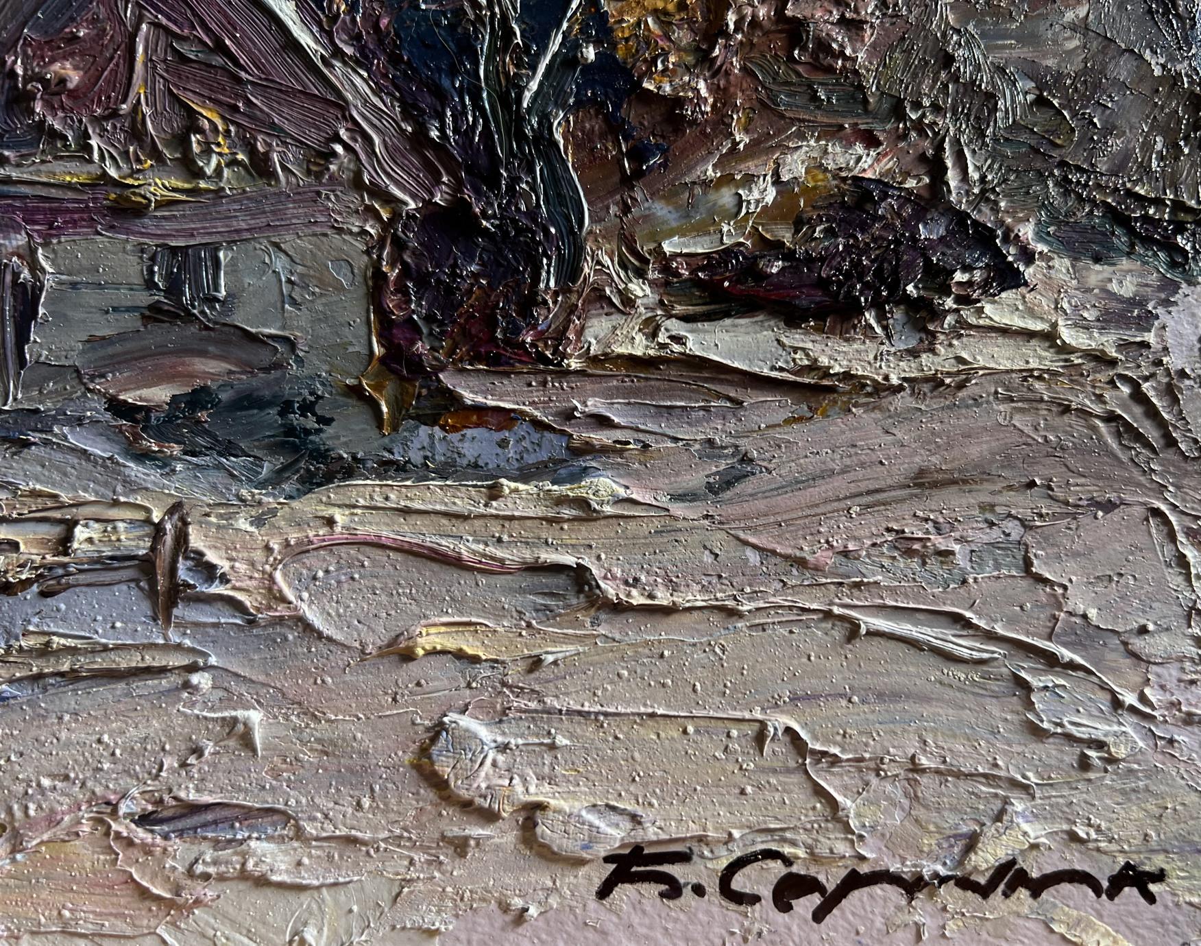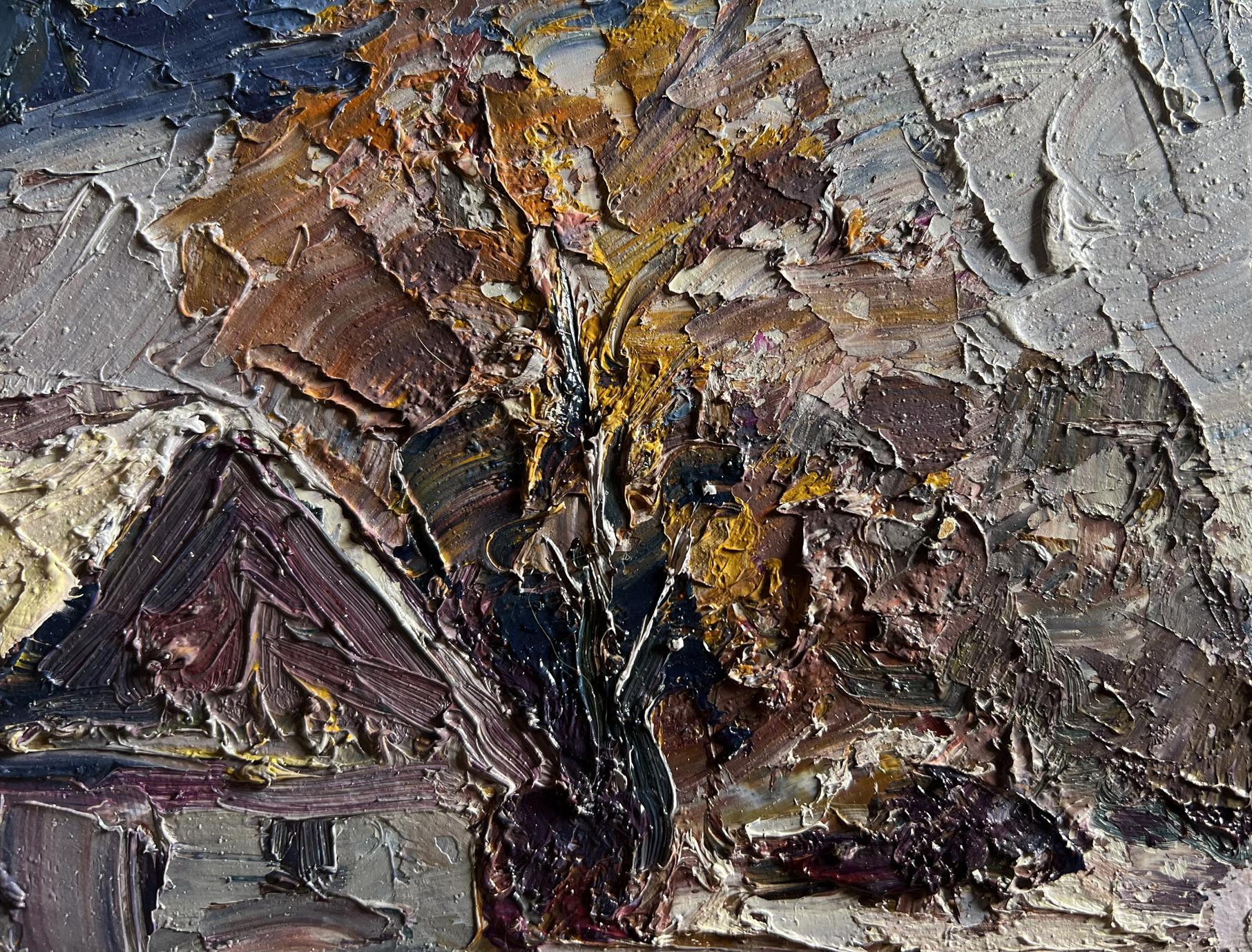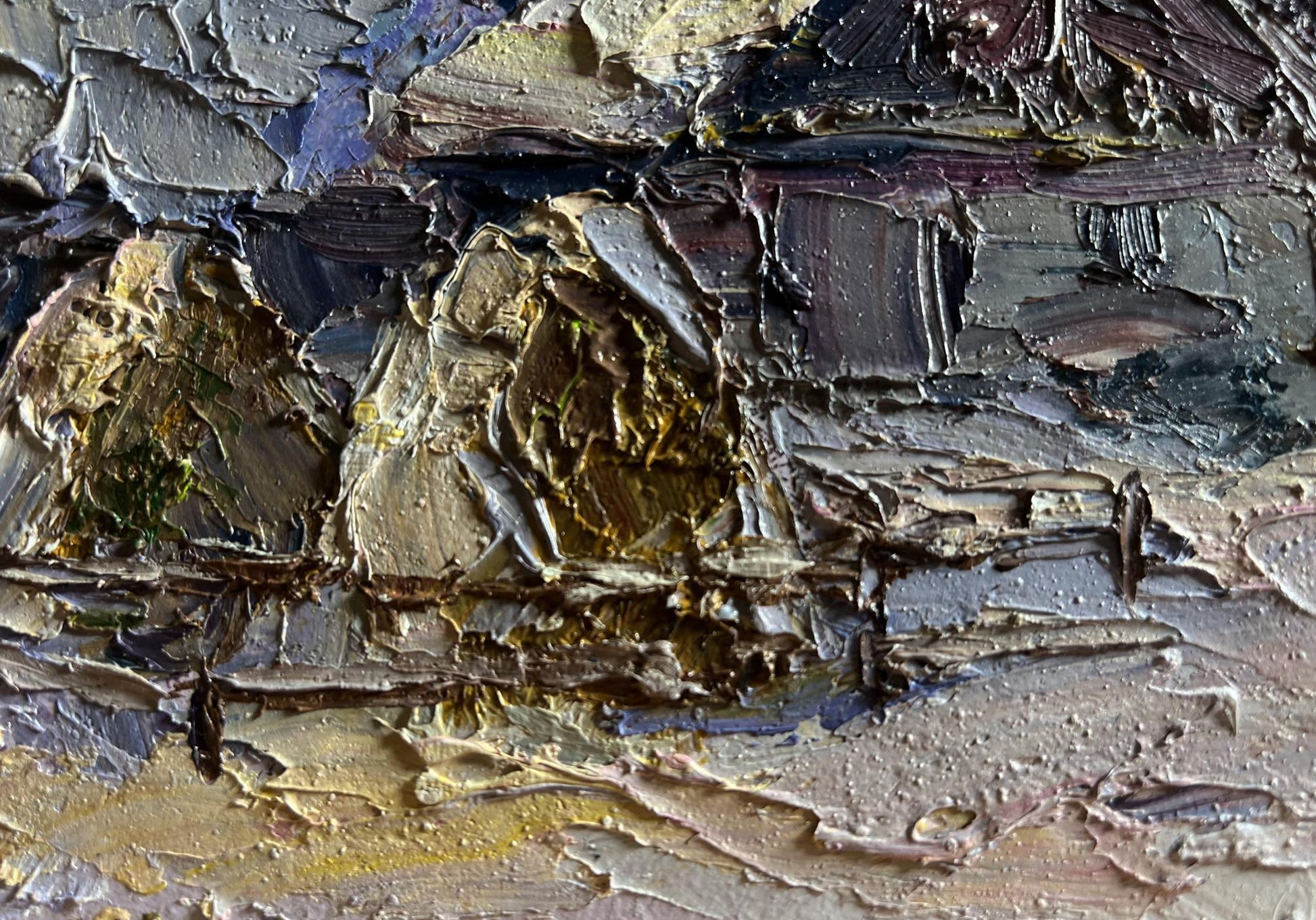 "Winter Village Evening" is a textured Oil painting on cardboard that captures the quiet beauty of a snow-covered rural landscape at dusk. The artist uses thick, expressive brushstrokes and a rich impasto technique to create depth and texture, giving the scene a tangible, almost sculptural quality.The foreground is dominated by the snow-covered ground, where patches of earth peek through the thick layers of white. The artist uses a mixture of warm and cool tones to depict the interplay of light and shadow on the uneven surface of the snow. This effect adds movement to the painting, making it feel as if the landscape is alive, shaped by the natural forces of winter.At the center of the composition, traditional village houses with steeply pitched roofs stand nestled among trees. Their roofs are heavy with fresh snow, emphasizing the weight of the season. The wooden walls, painted in dark earthy tones, contrast with the surrounding whiteness, making the structures appear sturdy and resilient against the cold. The artist’s technique captures the rough texture of the wood and the aged, weathered quality of the buildings, adding a sense of authenticity and nostalgia to the scene.To the left of the houses, two haystacks covered in snow stand enclosed by a rustic wooden fence. Their rounded shapes break the angularity of the architecture, bringing balance to the composition. The haystacks, painted with strokes of ochre and brown, add warmth to the predominantly cool palette, reminding the viewer of the village’s agricultural roots and the hard work that sustains it even in the harshest months.The background is dominated by a dense cluster of trees, their bare branches reaching toward the sky. Some of the trees still hold onto the last remnants of autumn, with golden leaves clinging to the branches, providing a striking contrast against the winter landscape. The sky, a deep mixture of blue and gray, suggests the approaching night, while hints of warm tones reflect the last light of the setting sun.Through "Winter Village Evening," the artist conveys a profound sense of peace and stillness. The painting evokes the warmth of home and the resilience of rural life, where nature and tradition exist in harmony. The heavy textures and dynamic brushstrokes reflect the raw beauty of winter, while the choice of color and composition create a mood of quiet contemplation. It is a scene that speaks of simplicity, endurance, and the comforting familiarity of home in the midst of the vast, snowy landscape.