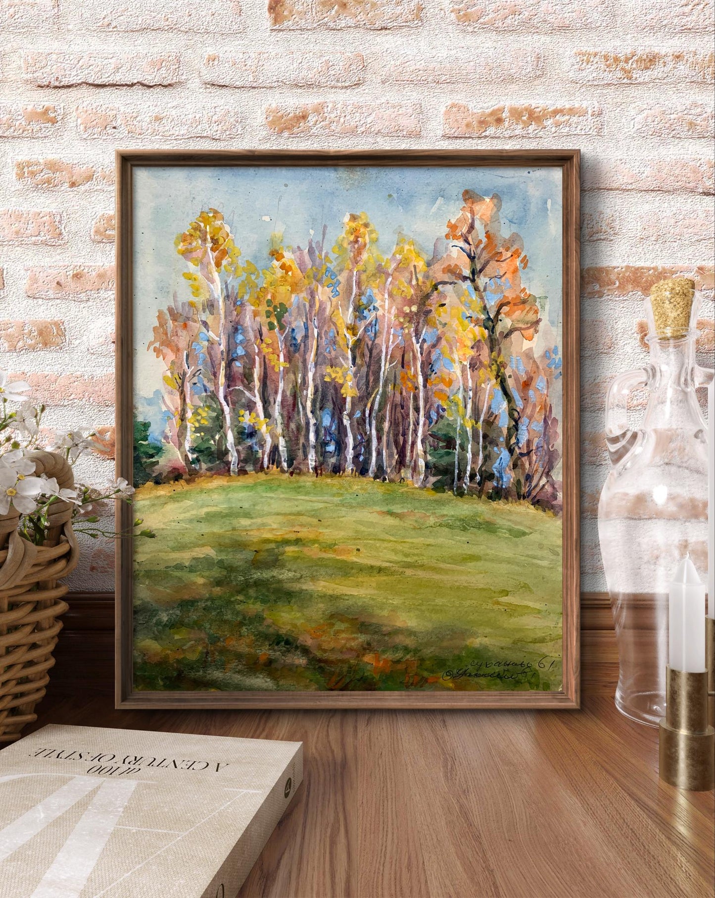 The watercolor painting titled "Golden Leaves" captures the tranquil beauty of a birch grove in autumn, emphasizing the richness of nature’s seasonal transformation. The composition centers around a cluster of tall, slender birch trees standing proudly in the sunlight. Their striking white trunks, accented by delicate shadows and splashes of golden and amber leaves, create a vivid contrast against the soft blue sky above and the green meadow below.The artist's use of warm, vibrant tones for the leaves — a blend of yellows, oranges, and hints of brown — showcases the fleeting glory of fall foliage. The trees appear to sway gently, as if moved by a soft breeze, giving the scene a sense of life and dynamism. The interplay of light and shadow on the leaves suggests that the grove is bathed in sunlight, creating a luminous, almost ethereal quality.The foreground features a wide expanse of grass painted in varied shades of green, from muted olive to bright lime, with subtle strokes suggesting the texture of a meadow. This open space provides a calm, grounding balance to the verticality of the trees, drawing the viewer’s gaze upwards to appreciate the beauty of the canopy.The background fades softly into blue and purple hues, hinting at the depth of the forest beyond the birches. This layered effect adds dimension and perspective to the painting, enhancing its immersive quality. The sky, painted in soft washes of pale blue, transitions seamlessly into the golden tones of the treetops, creating a harmonious blend of cool and warm colors.Through "Golden Leaves," the artist aims to celebrate the beauty of autumn as a time of change and reflection. The birch grove, with its golden foliage, becomes a symbol of resilience and grace, standing tall amid the inevitable cycles of nature. The painting invites viewers to pause, take in the moment, and find peace in the simple yet profound beauty of the natural world.
